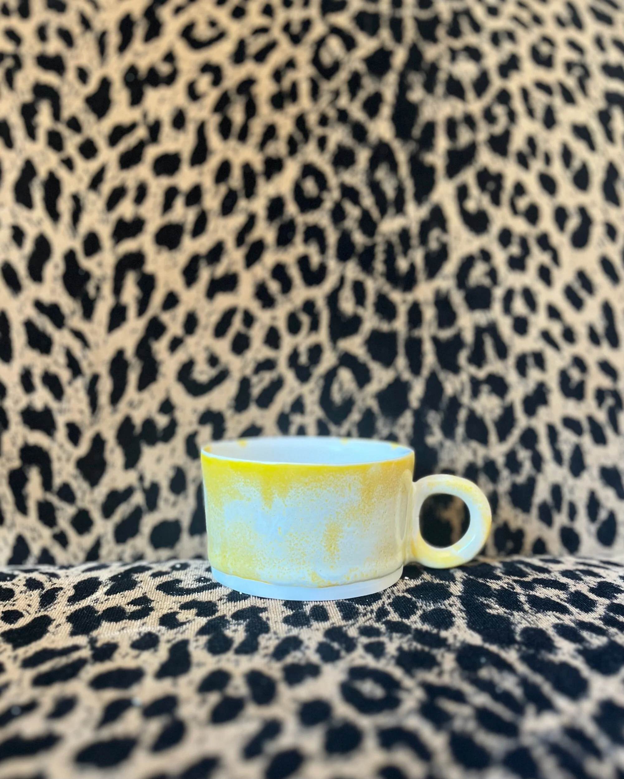 8 oz. mug, approximately 3 inches tall. Microwave and dishwasher safe. Only one of each color available, each one is hand thrown and one of a kind.